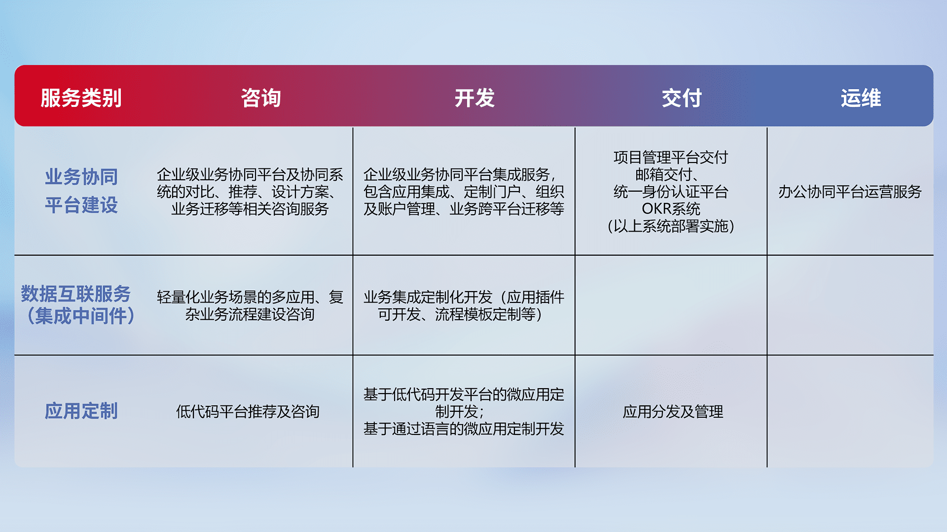 针对钉钉、、、企微、、IDaas等平台级产品提供产品的规划、、方案、、、交付、、、、定制化开发等服务,,,实现如统一协同办公、、智能客户服务、、混合会议管理、、智能数据查询、、等业务场景,,实现数字化转型。。。