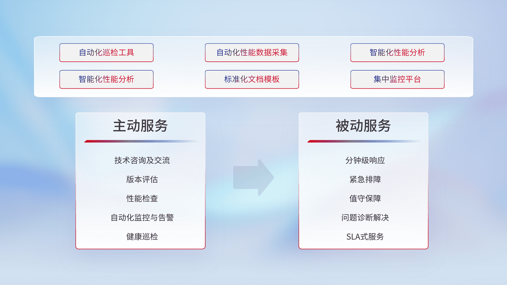 智能化工具和标准化文档,,,保障服务质量,,,,提供主动服务(包含技术咨询、、版本评估、、性能检查、、、、自动化监控与告警、、、、健康巡检)和被动服务包含(分钟级响应、、、、紧急排障、、值守保障、、、问题诊断解决、、、、SLA服务)。。
